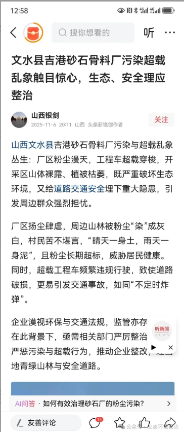 山西文水縣吉港砂石骨料廠(chǎng)污染與超載亂象叢生:廠(chǎng)區(qū)粉塵漫天,工程車(chē)超載穿梭,開(kāi)采區(qū)山體裸露、植被枯萎,既嚴(yán)重破壞生態(tài)環(huán)境,又給道路交通安全埋下重大隱患,引發(fā)周邊群眾強(qiáng)烈擔(dān)憂(yōu)。